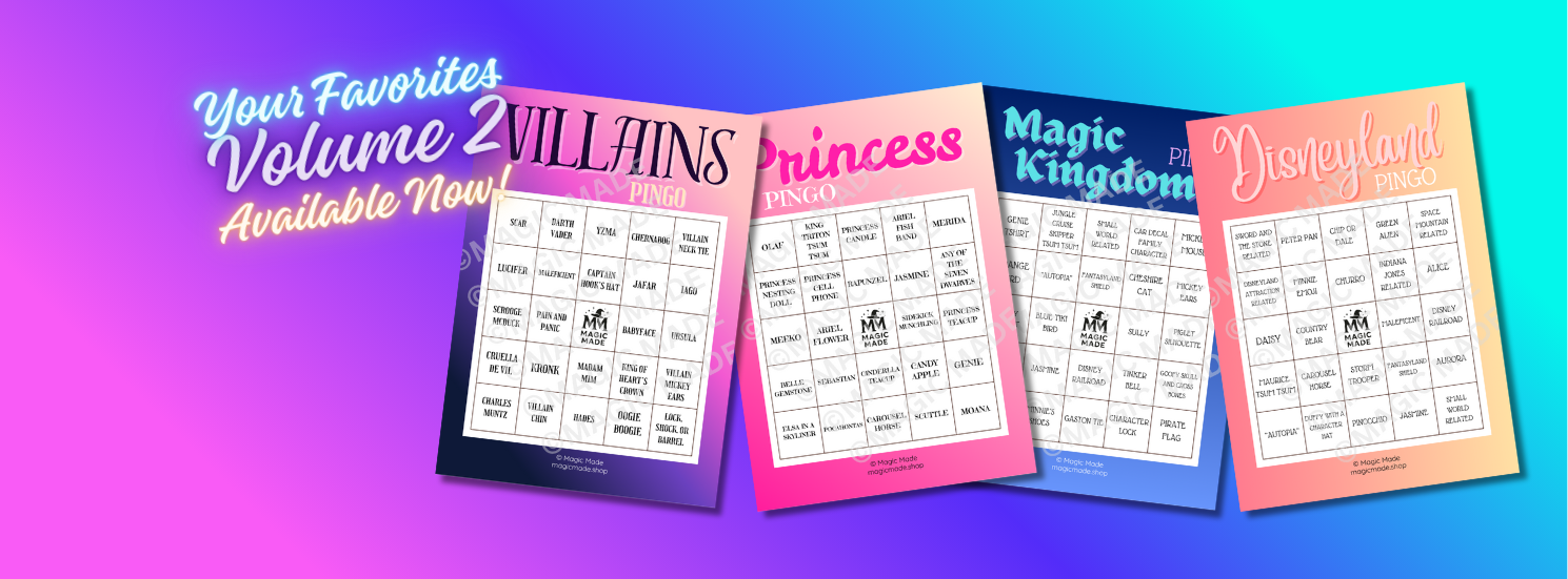 Park pingo boards featuring an array of prompts including characters, themes, and movies! Boards for both Disney World and Disneyland parks!